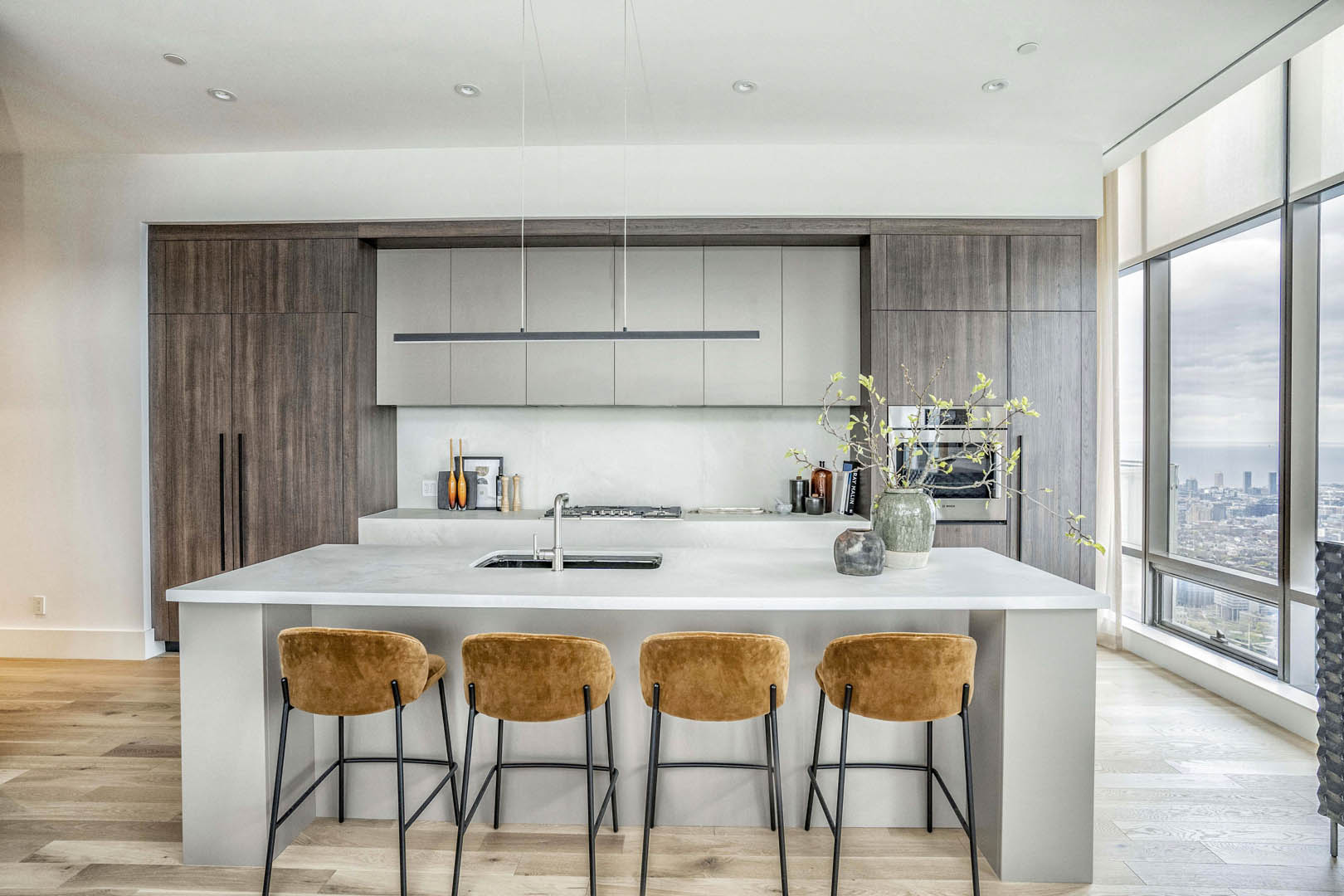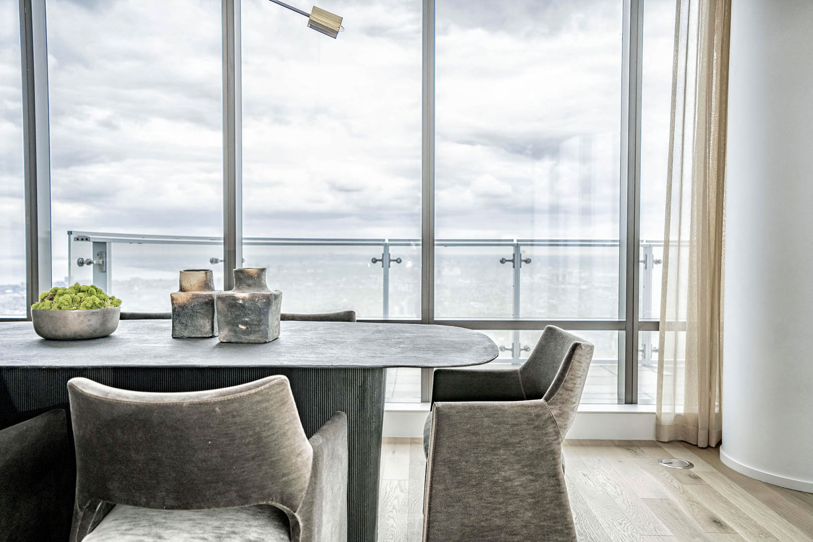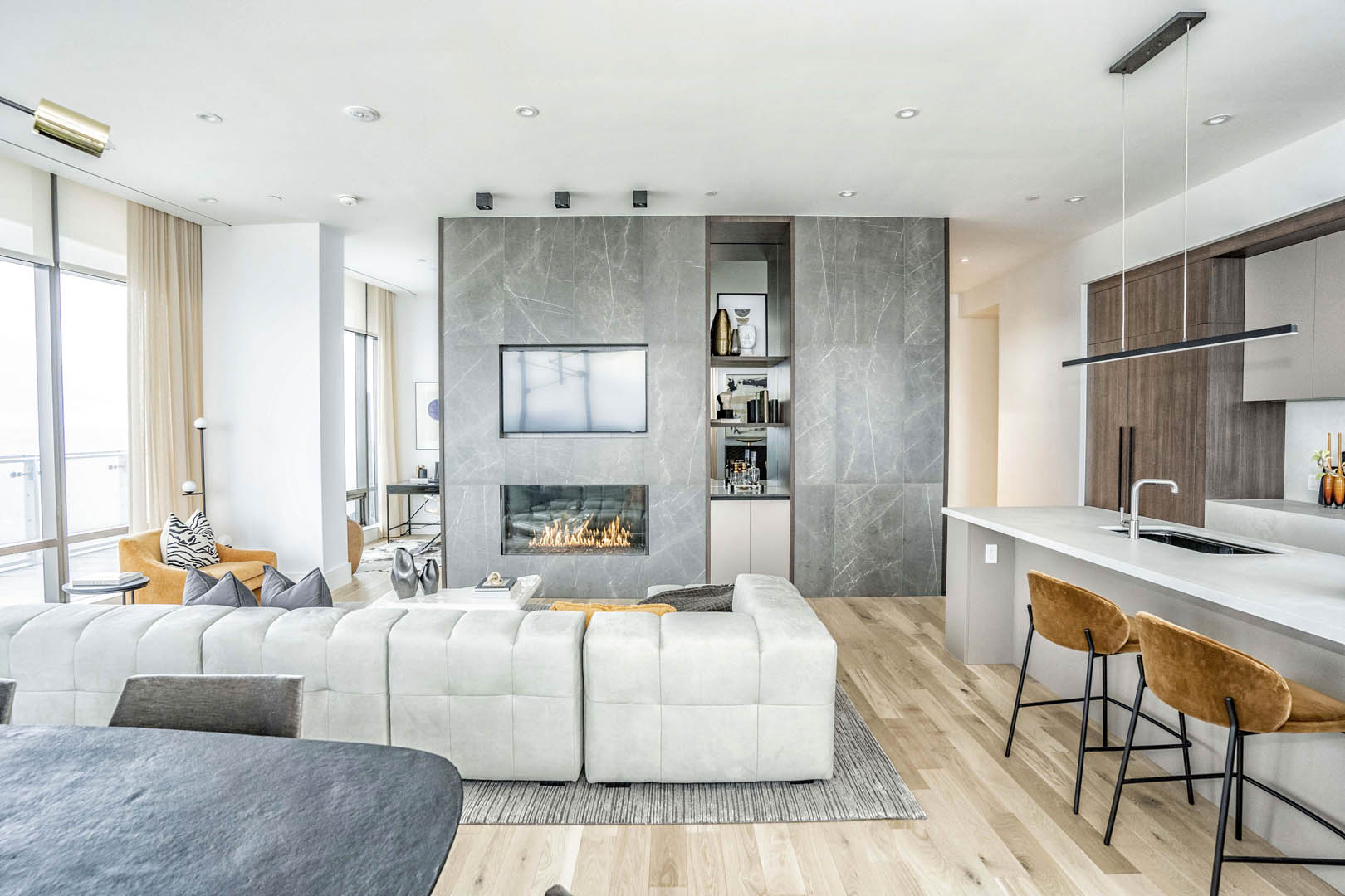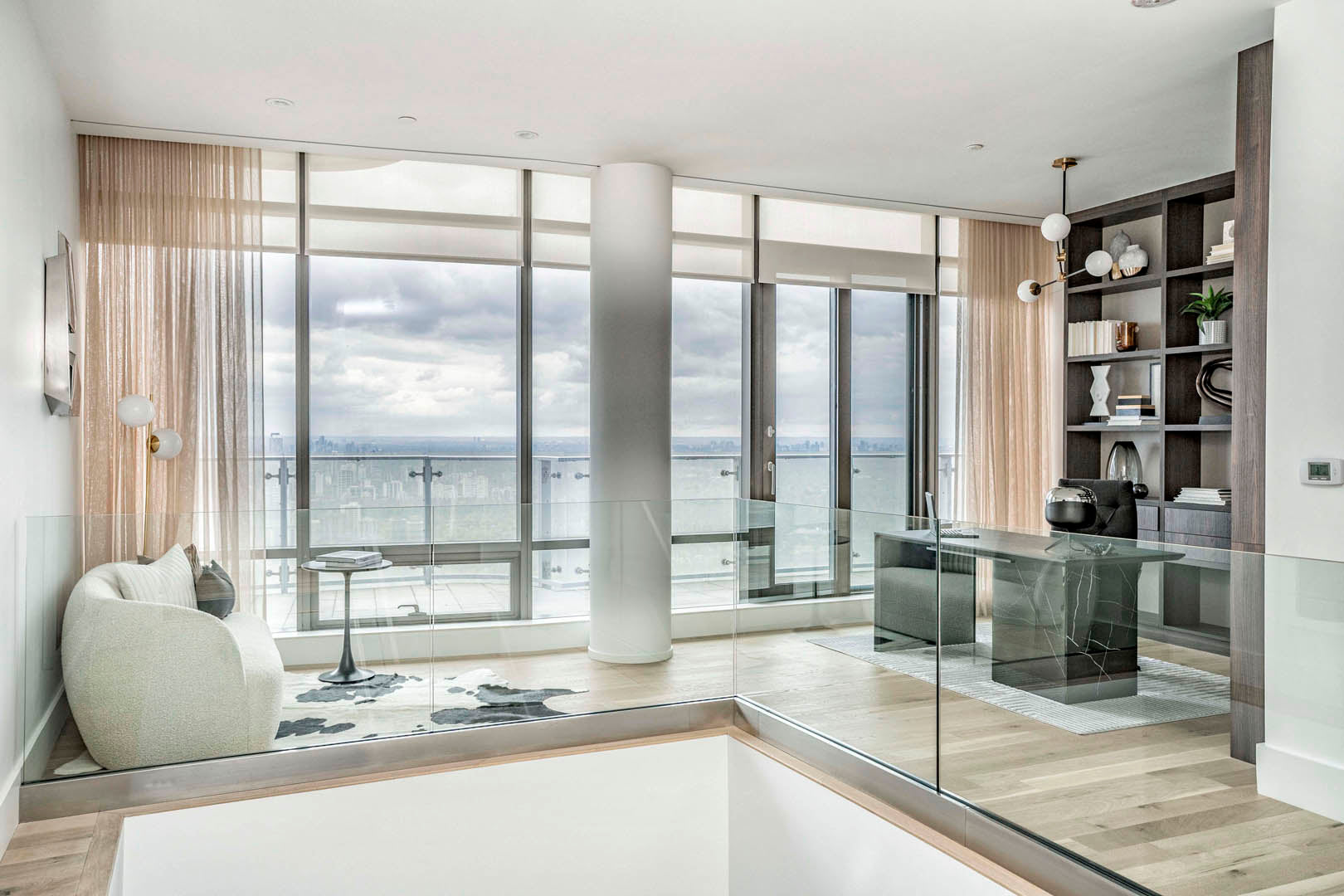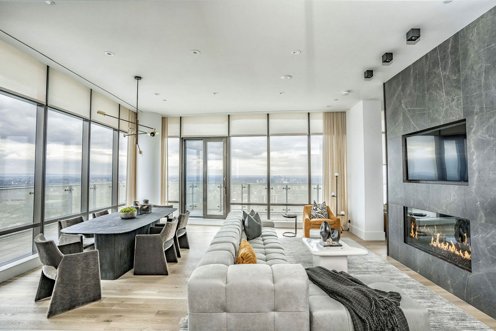 This two-level luxury penthouse model suite for Great Gulf at One Bloor reflects modern luxury living in the heart of Toronto. Floor-to-ceiling windows bring in incredible natural light and city views, while sculptural furnishings, soft textures, and a calm neutral palette create a refined yet inviting feel. A statement stone fireplace anchors the living space, grounding the design and adding warmth. Thoughtfully styled and effortless in tone, the suite is designed to help buyers instantly connect with the lifestyle of this iconic address.