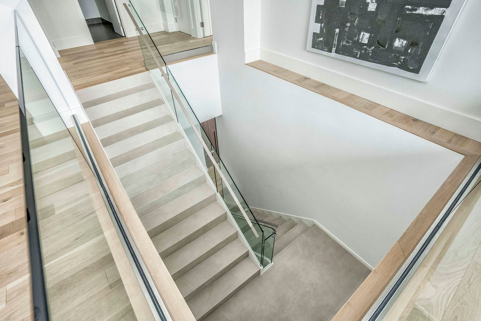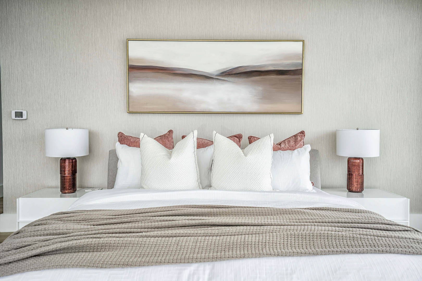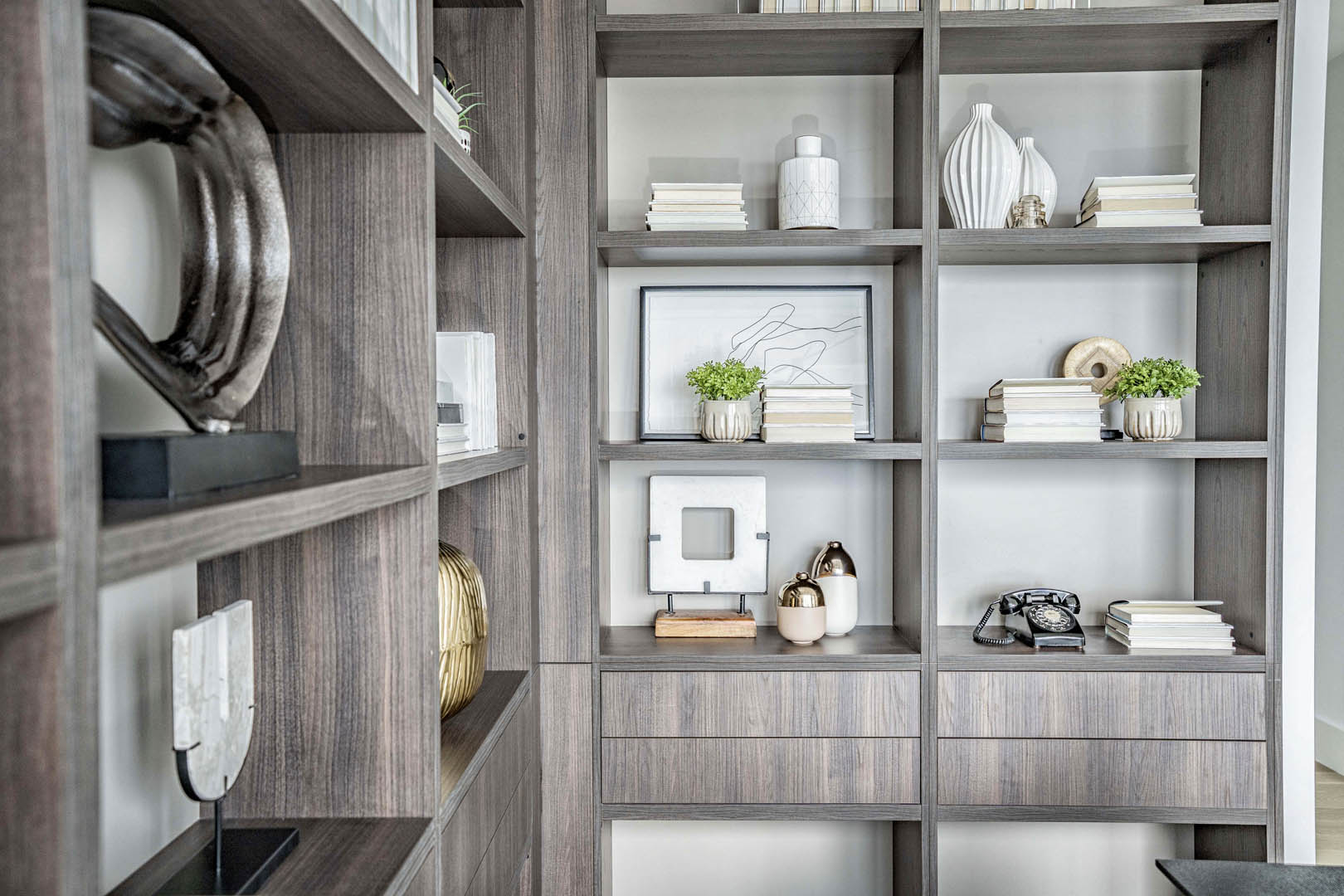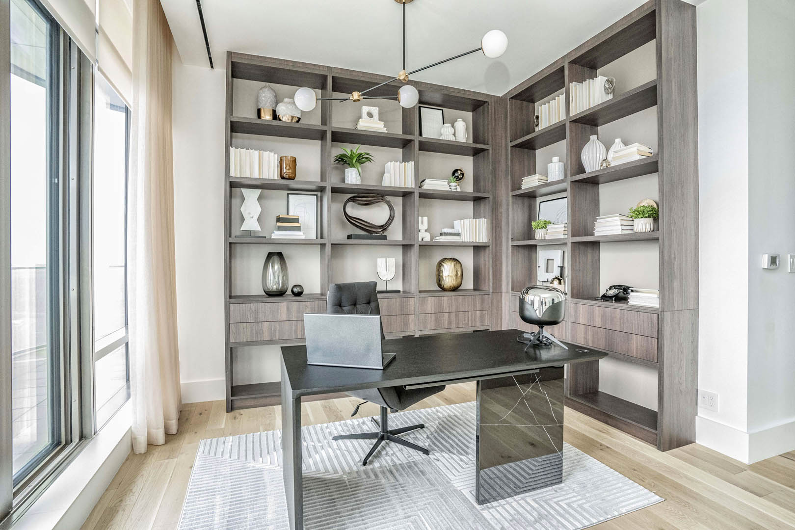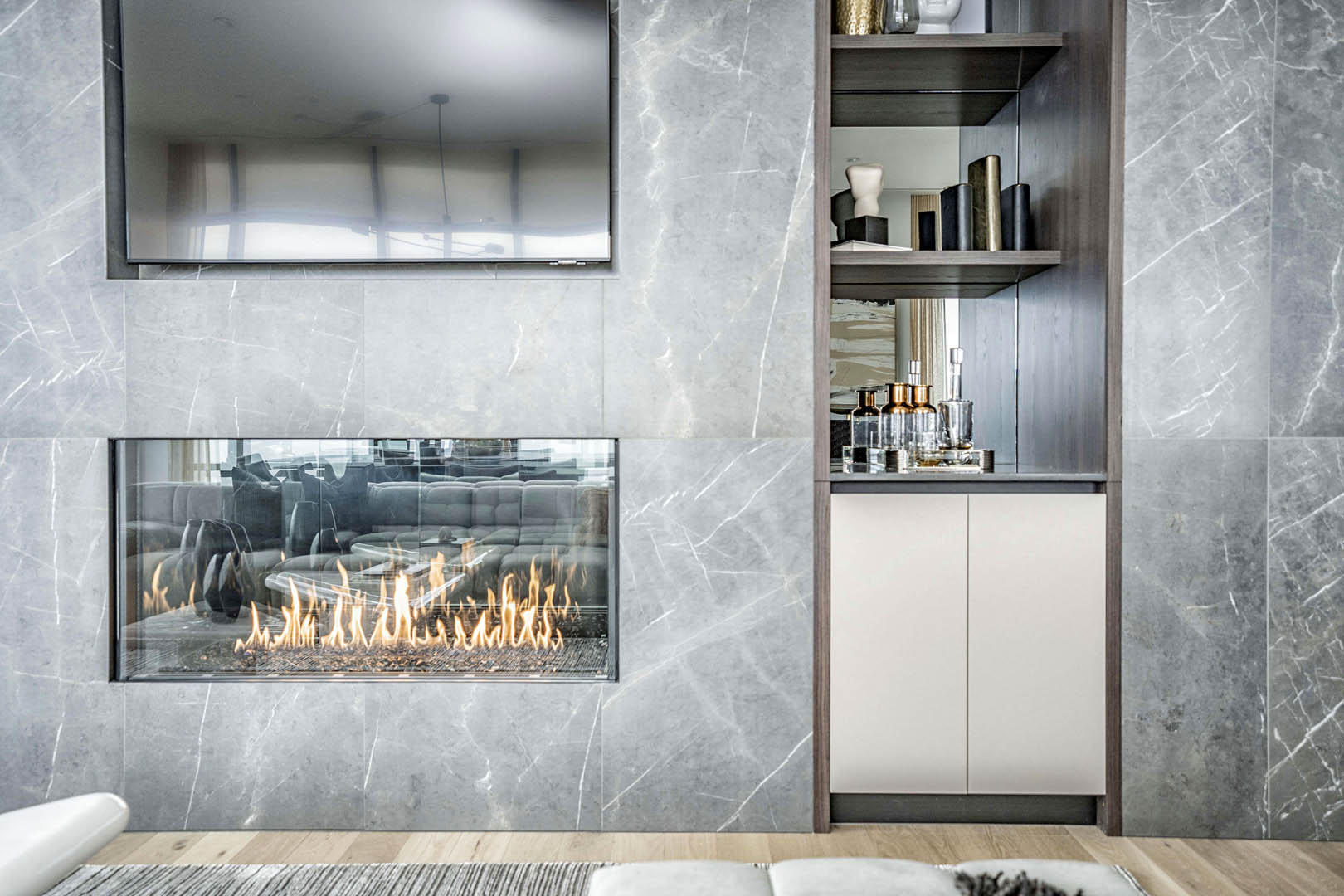 This two-level luxury penthouse model suite for Great Gulf at One Bloor reflects modern luxury living in the heart of Toronto. Floor-to-ceiling windows bring in incredible natural light and city views, while sculptural furnishings, soft textures, and a calm neutral palette create a refined yet inviting feel. A statement stone fireplace anchors the living space, grounding the design and adding warmth. Thoughtfully styled and effortless in tone, the suite is designed to help buyers instantly connect with the lifestyle of this iconic address.