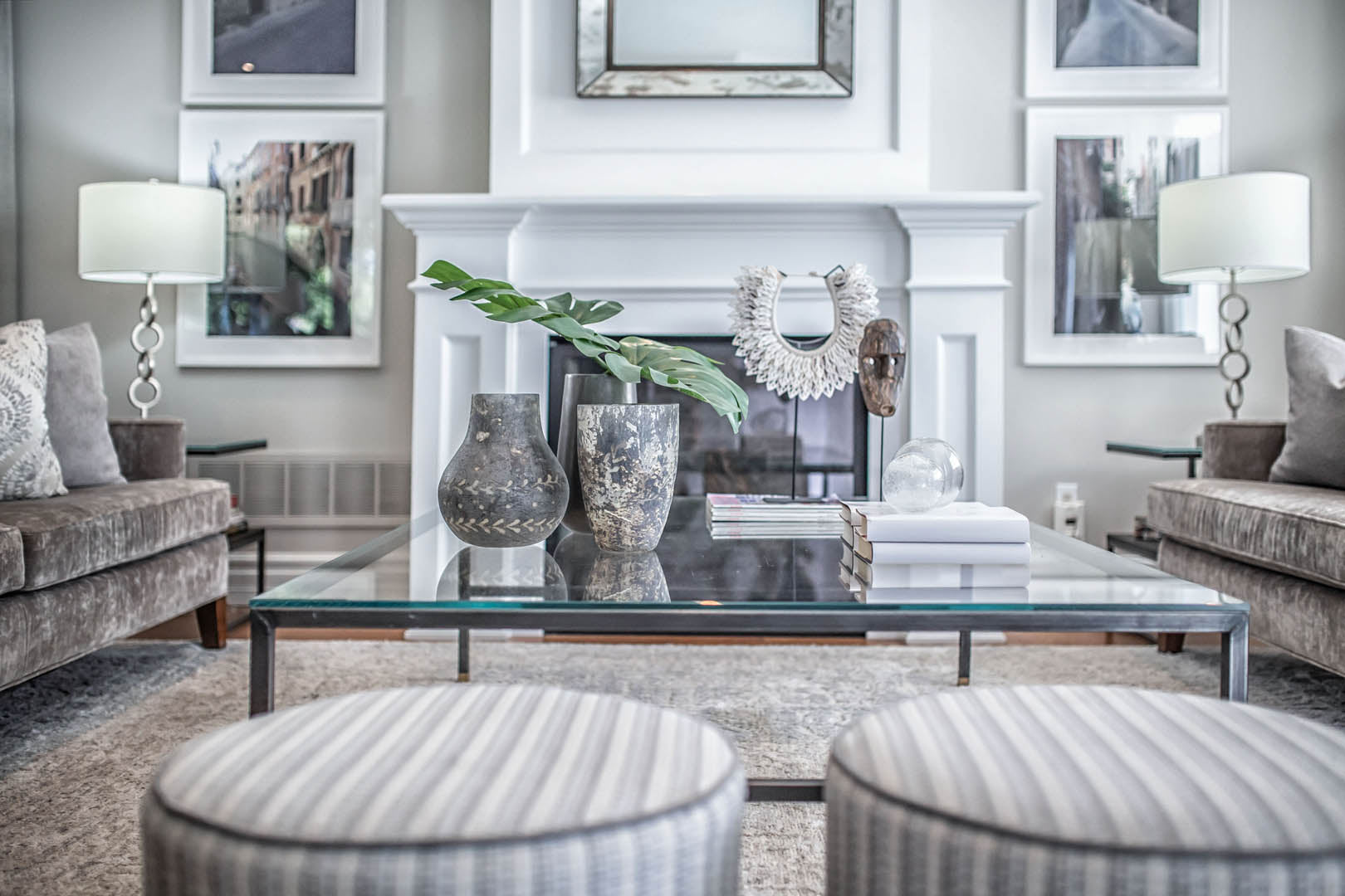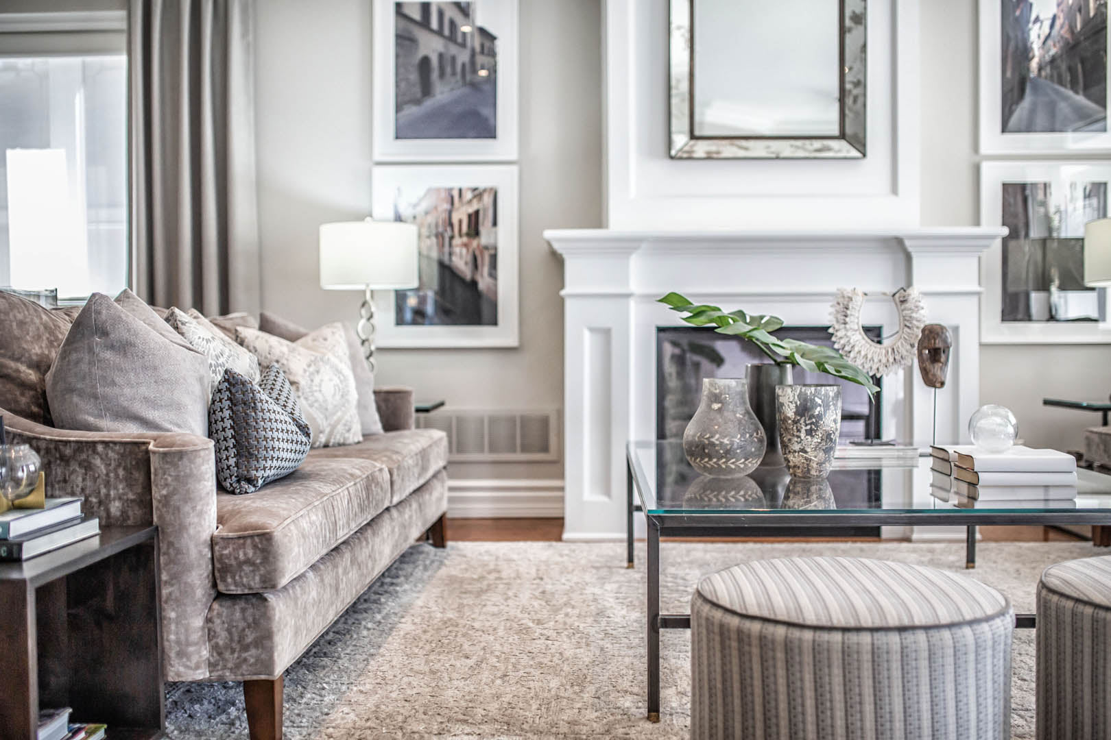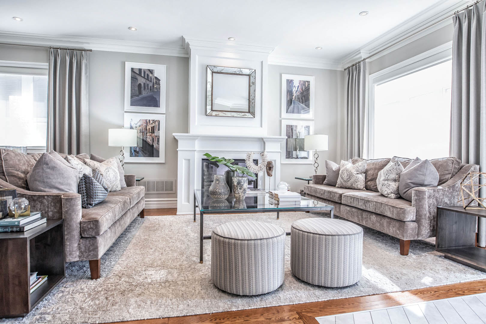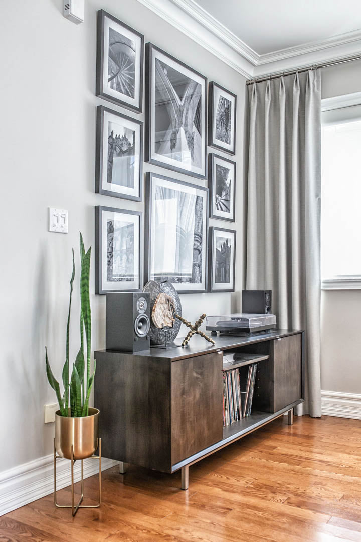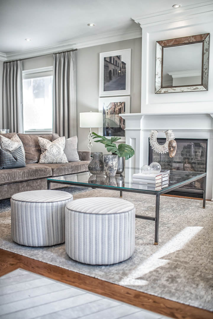 This four-bedroom, four-level home was designed around a strict palette of beiges and browns—at the clients’ request—while making sure the space still felt rich and engaging. To avoid a flat or predictable look, we leaned into texture and contrast, layering plush rugs, tailored drapery, and a mix of matte and reflective finishes throughout. Soft, layered lighting adds warmth and depth, giving each room its own mood while staying within the same tonal family. Their love of travel became a key design moment, with a curated display of posters and photography thoughtfully showcased in the basement media room. The result is a calm, cohesive home that feels warm and personal—proof that neutral doesn’t have to mean boring.