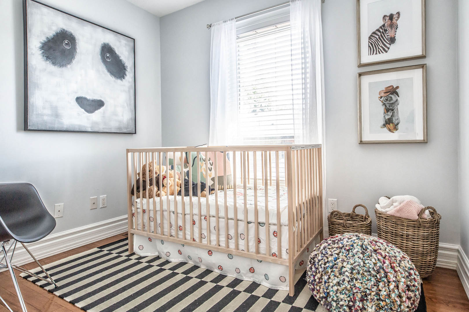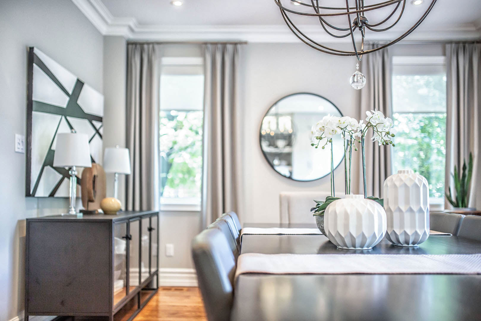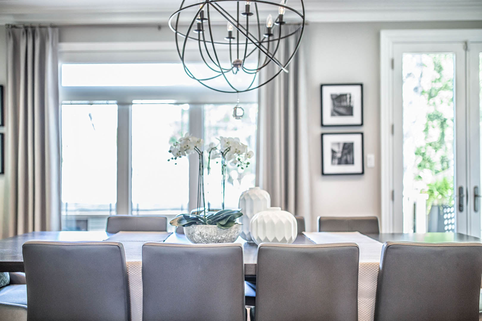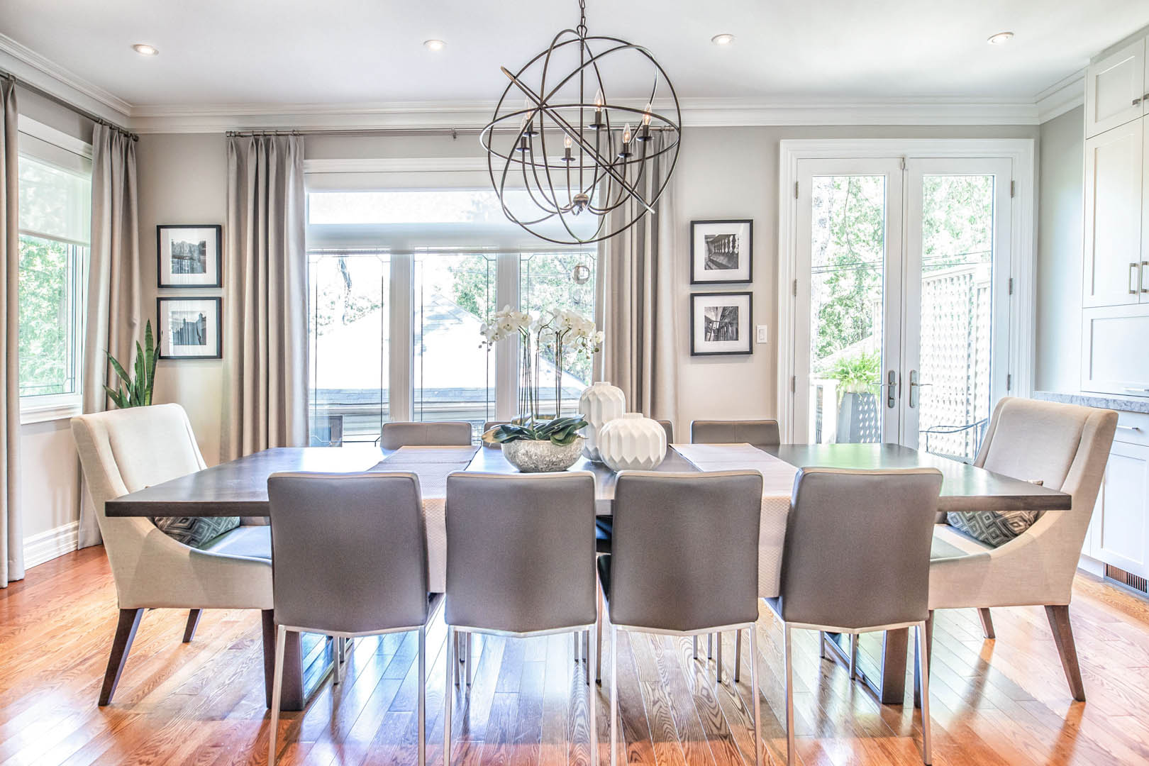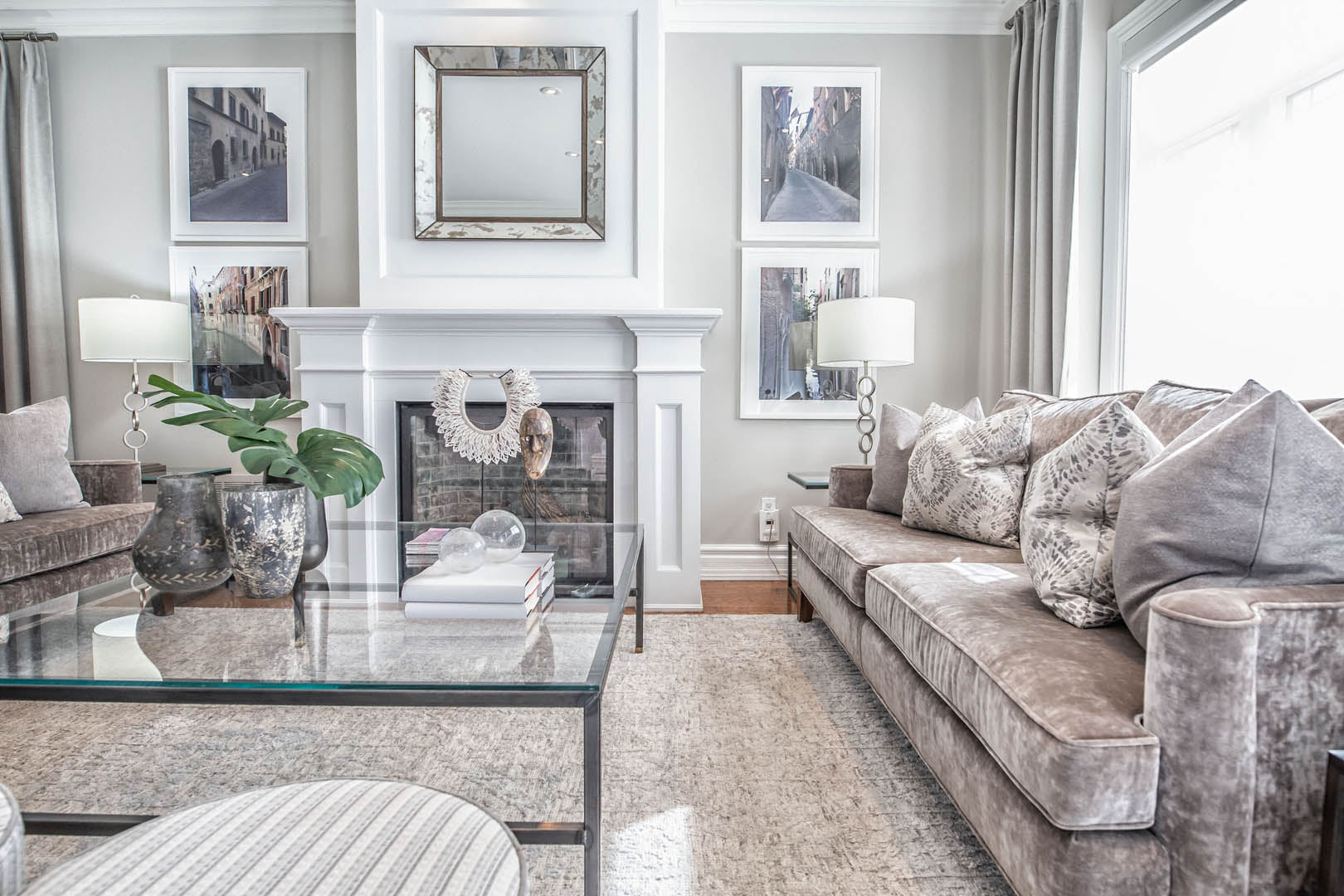 This four-bedroom, four-level home was designed around a strict palette of beiges and browns—at the clients’ request—while making sure the space still felt rich and engaging. To avoid a flat or predictable look, we leaned into texture and contrast, layering plush rugs, tailored drapery, and a mix of matte and reflective finishes throughout. Soft, layered lighting adds warmth and depth, giving each room its own mood while staying within the same tonal family. Their love of travel became a key design moment, with a curated display of posters and photography thoughtfully showcased in the basement media room. The result is a calm, cohesive home that feels warm and personal—proof that neutral doesn’t have to mean boring.