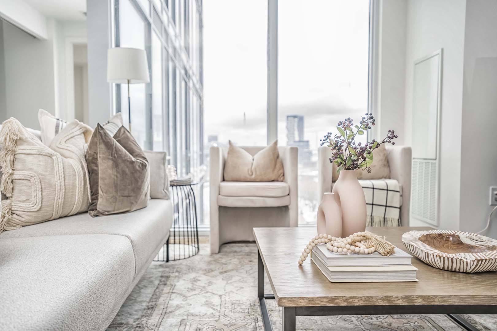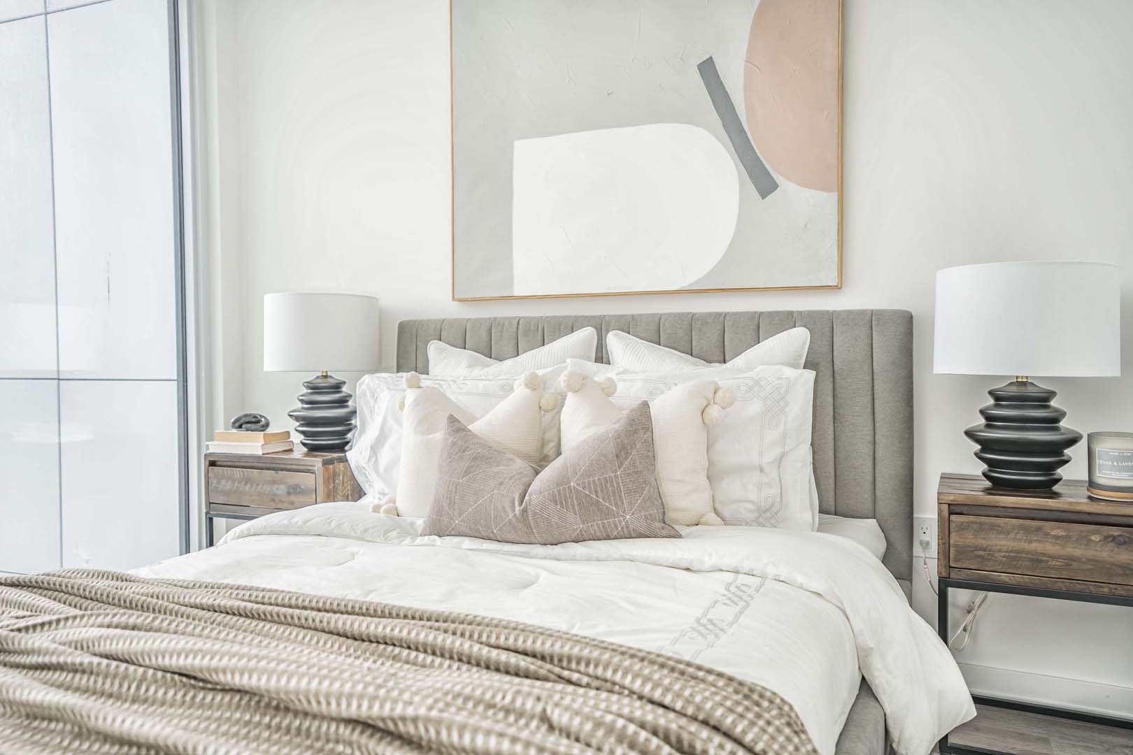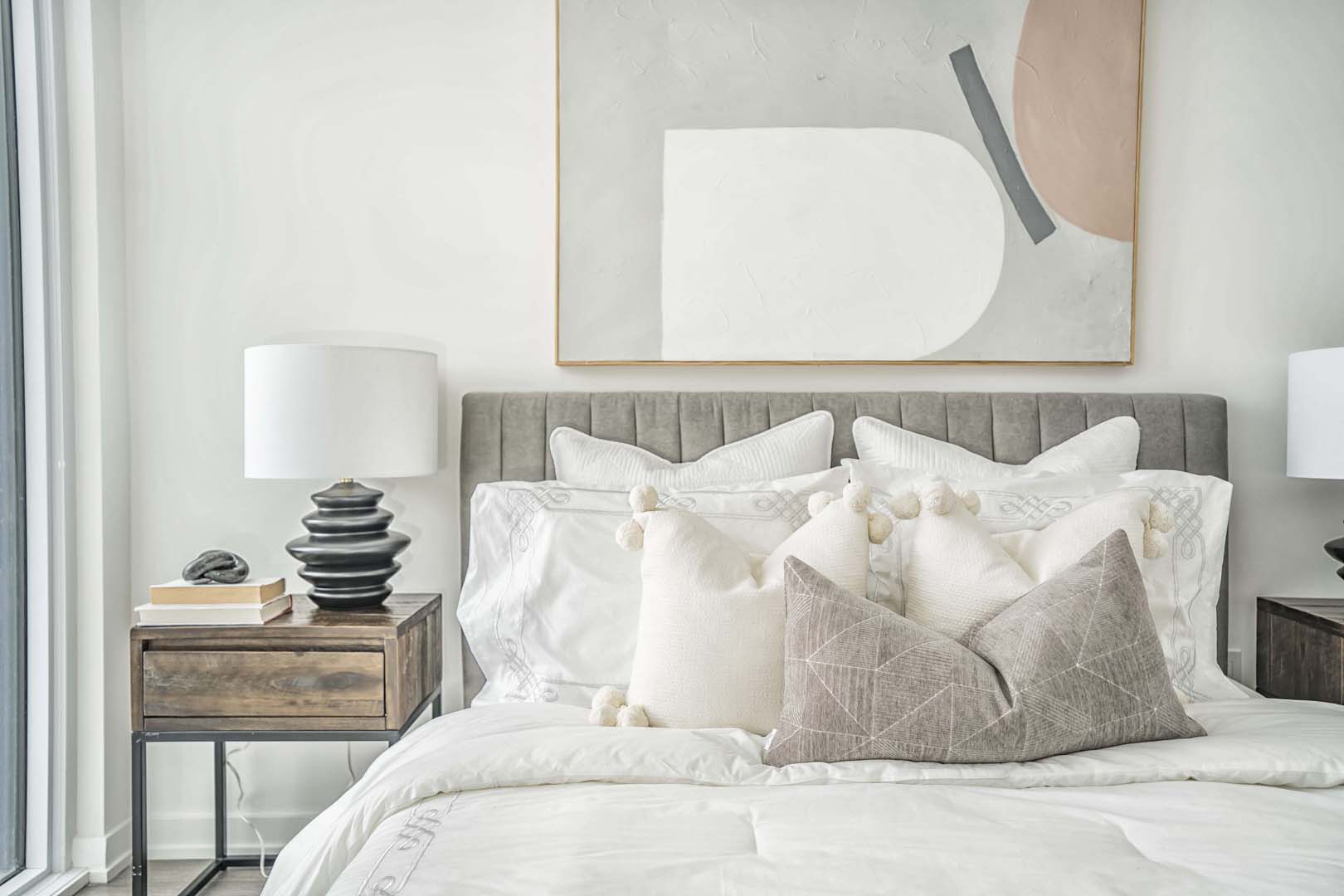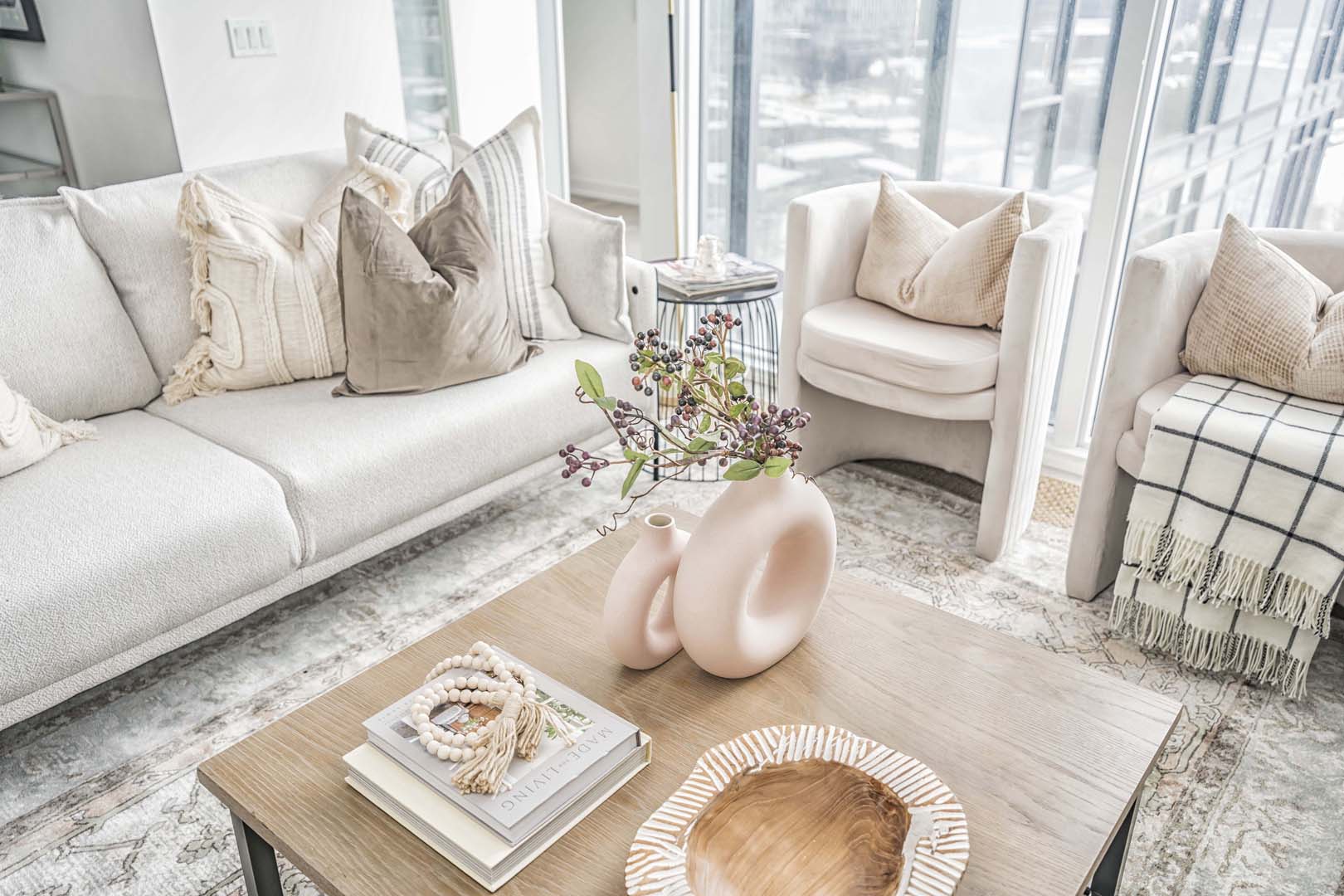 Designed for Great Gulf, this 3-bedroom high-rise home in Toronto is all about showcasing smart layout and livable design. Furniture was carefully selected at the right scale to maximize flow, function, and comfort, allowing each space to feel open without sacrificing style. A soft, neutral palette keeps the look cohesive while layering in texture and warmth through accessories and finishes. The third bedroom was intentionally styled as a dedicated home office, helping buyers easily visualize flexible, real-life living in a modern urban setting.