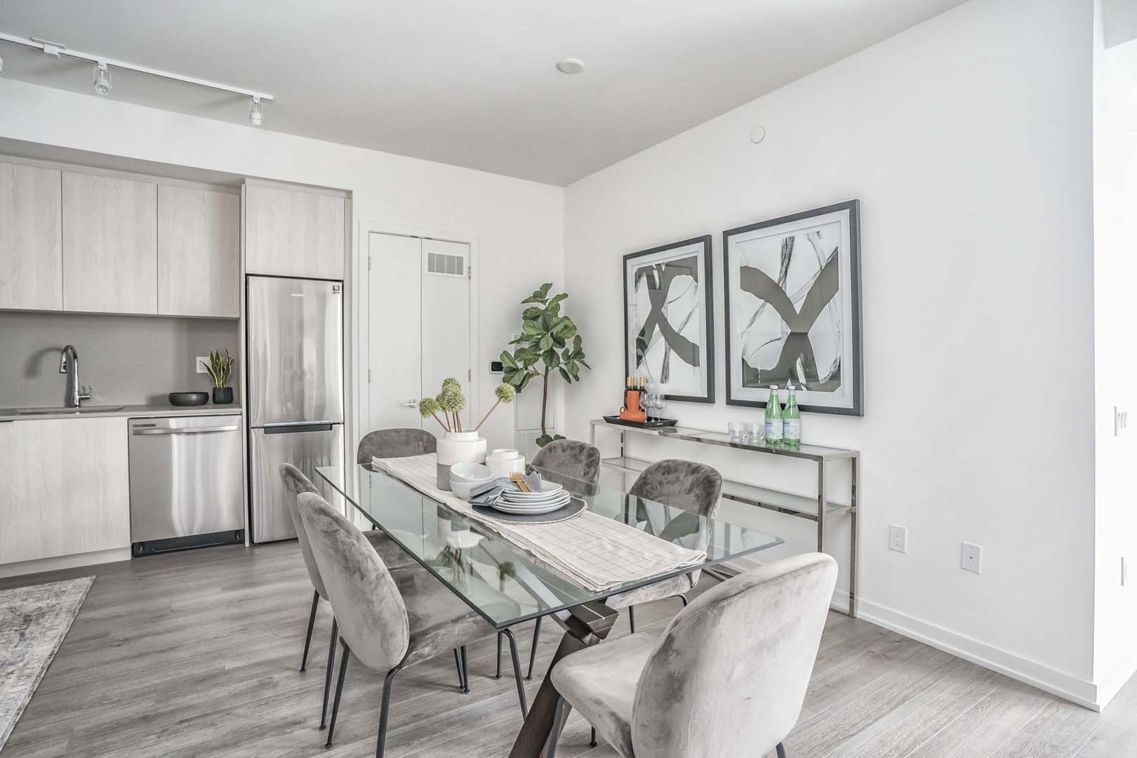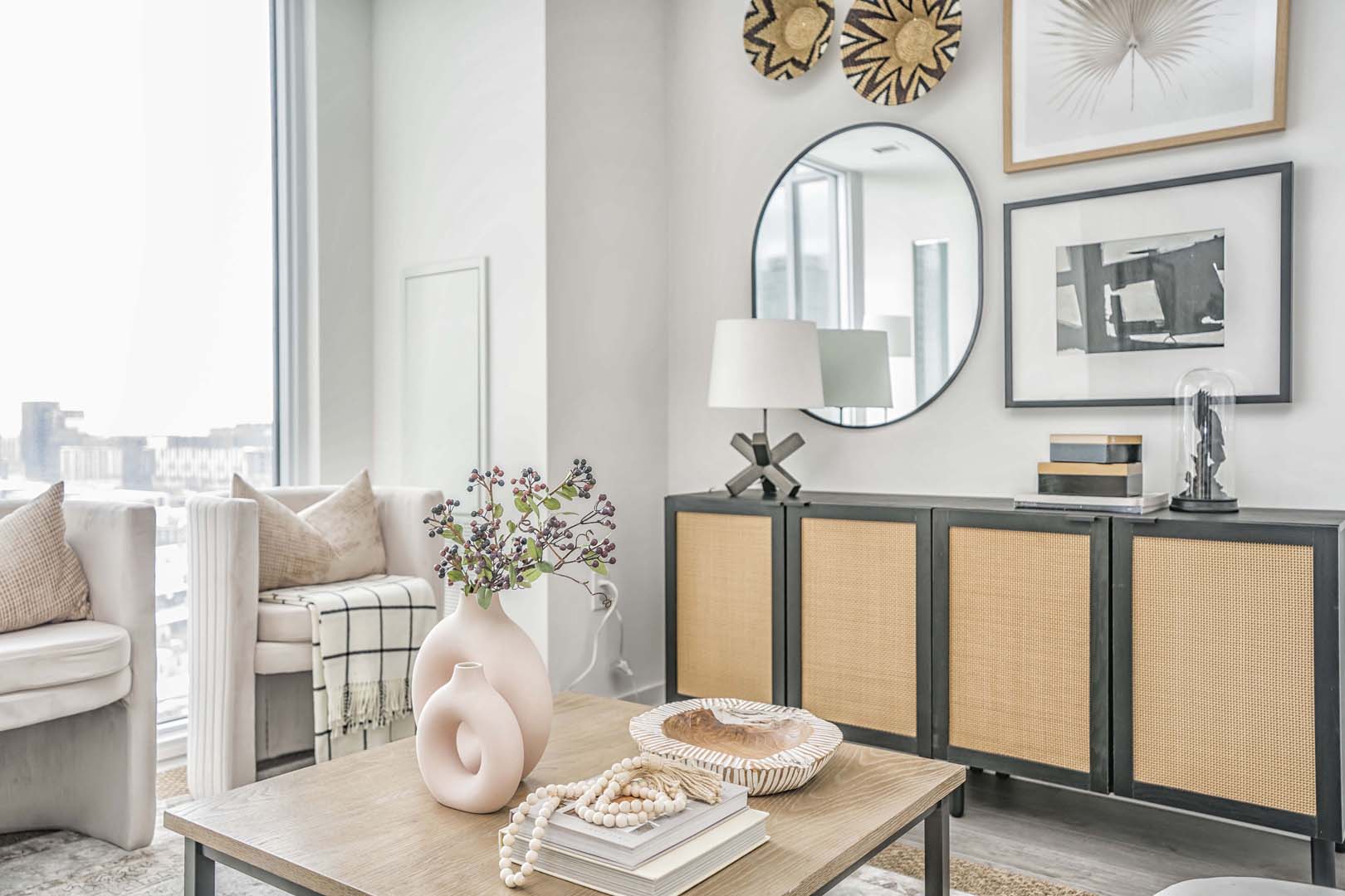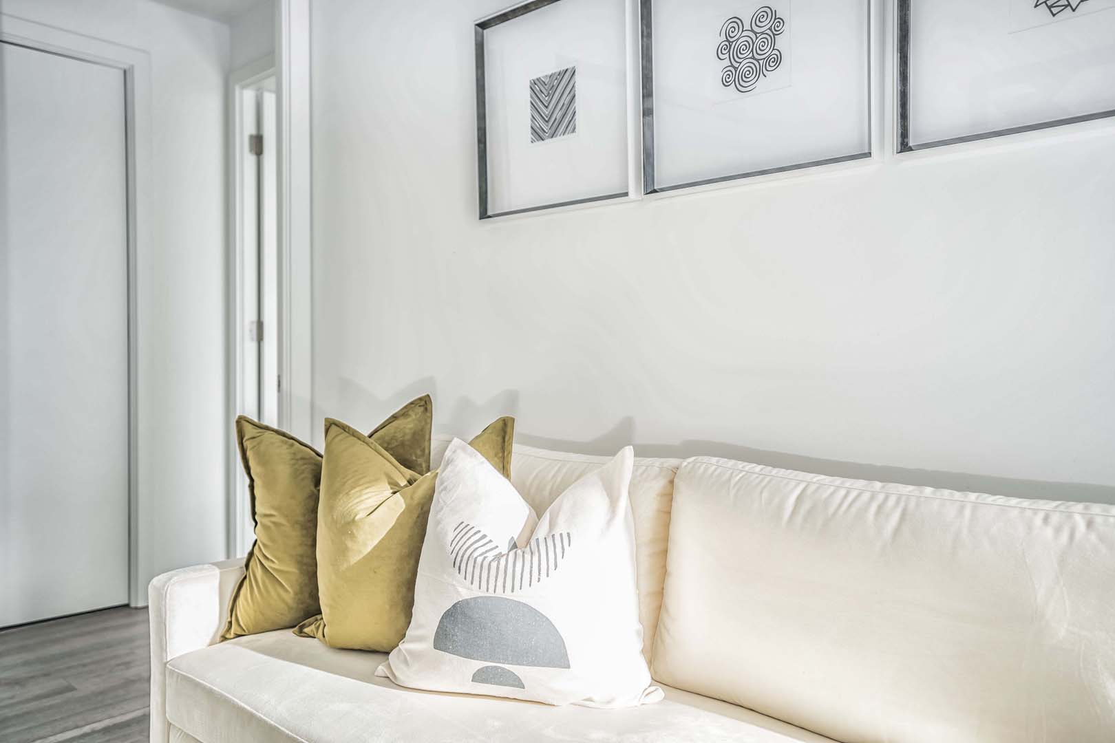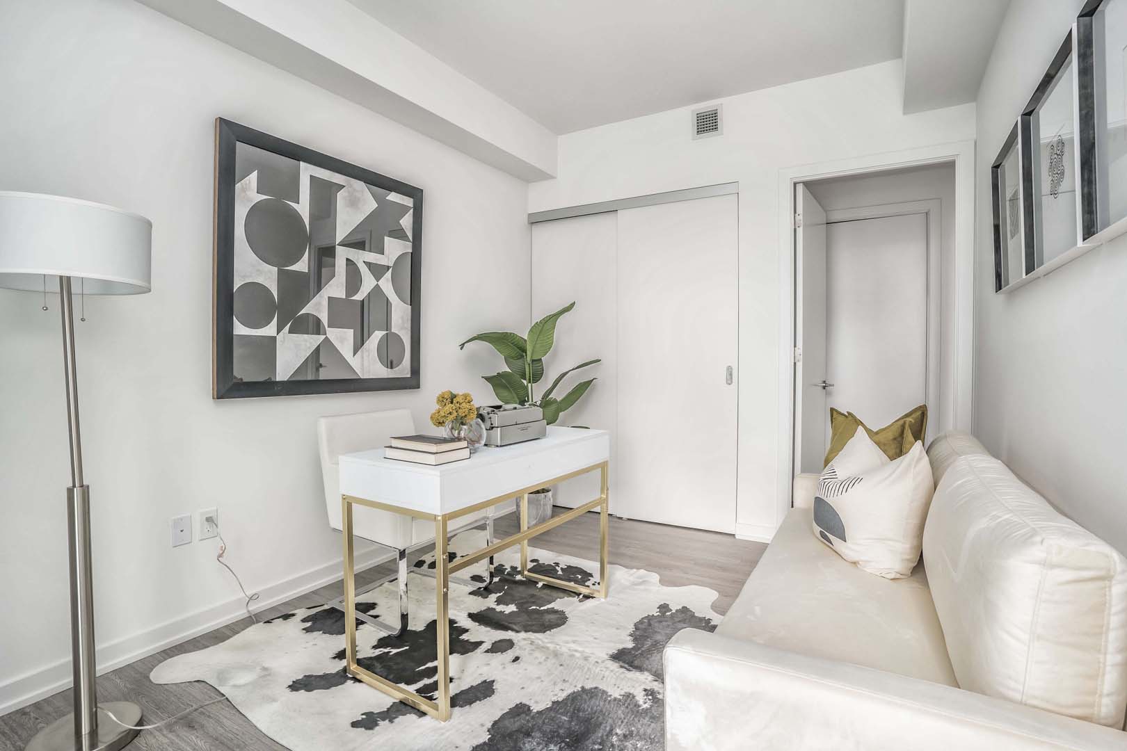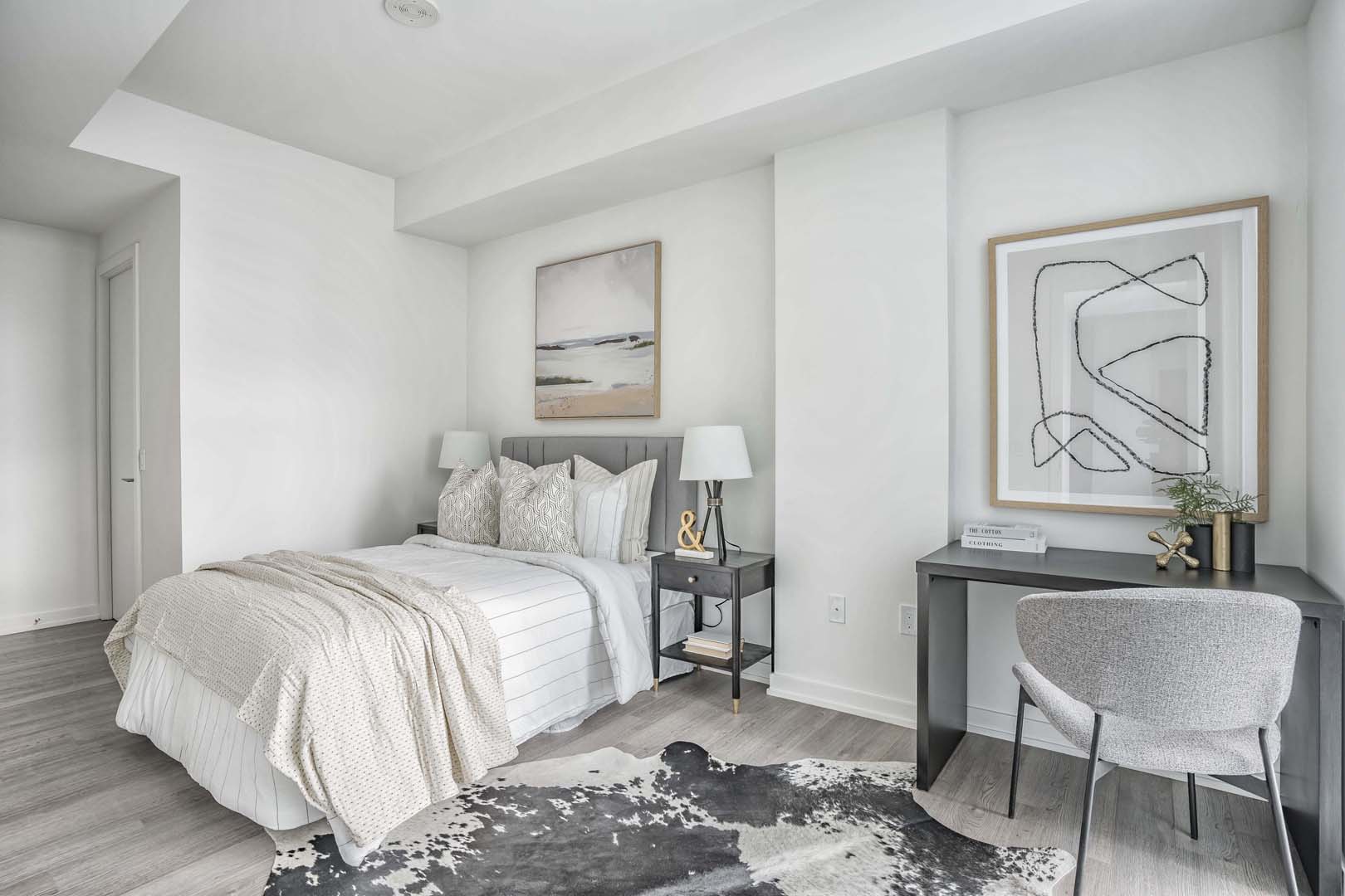 Designed for Great Gulf, this 3-bedroom high-rise home in Toronto is all about showcasing smart layout and livable design. Furniture was carefully selected at the right scale to maximize flow, function, and comfort, allowing each space to feel open without sacrificing style. A soft, neutral palette keeps the look cohesive while layering in texture and warmth through accessories and finishes. The third bedroom was intentionally styled as a dedicated home office, helping buyers easily visualize flexible, real-life living in a modern urban setting.