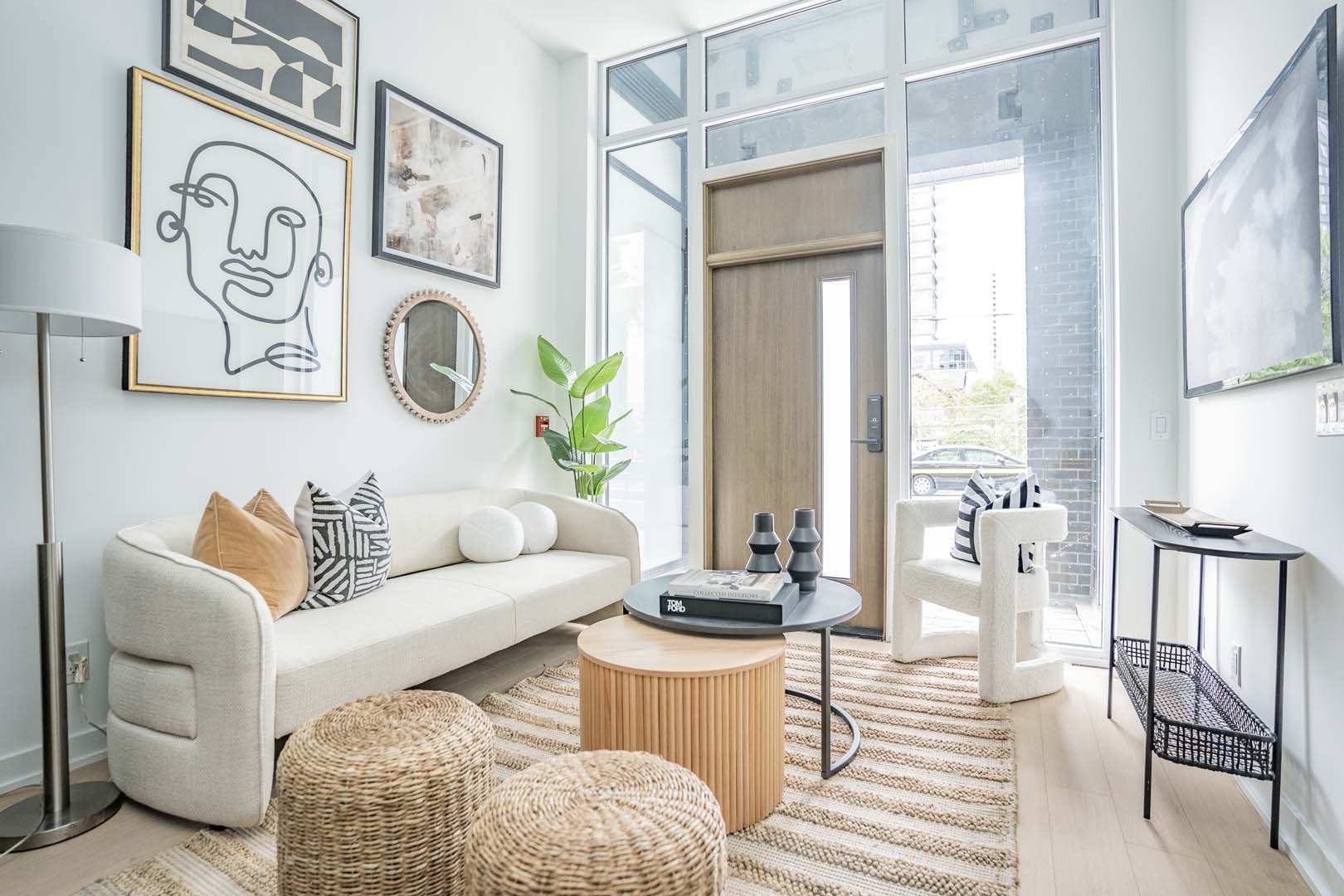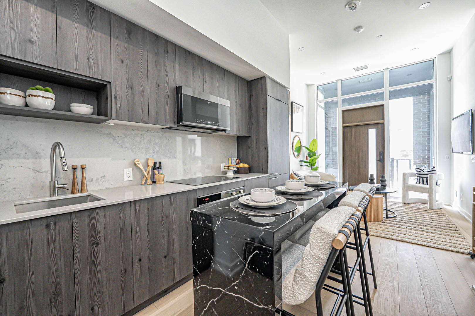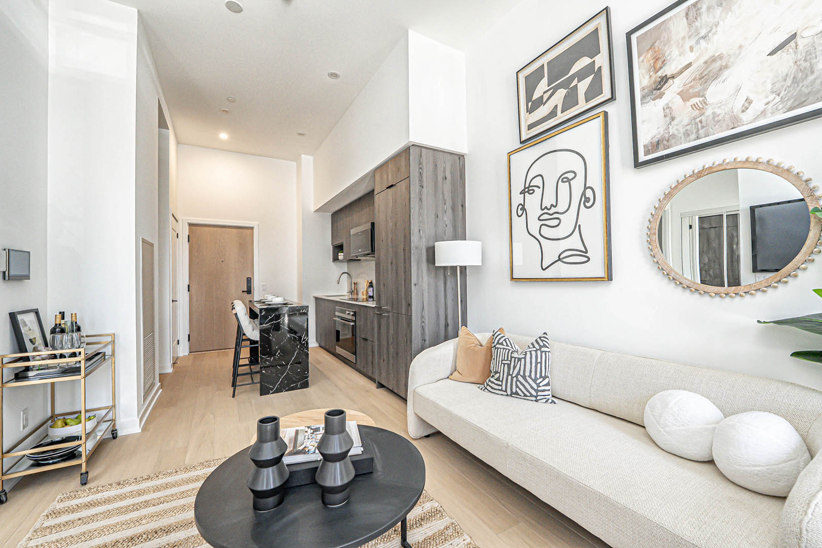 Designed for Broccolini, this 3-bedroom model suite was created with function in mind, where every square foot had to work harder. The tight layout called for a flexible solution, so we introduced a movable kitchen island that functions as a dining space while doubling as extra prep and counter area. Clean-lined cabinetry, layered neutrals, and textured accents keep the space feeling open and intentional rather than crowded. The result is a thoughtfully designed home that proves smart planning and well-scaled furniture can completely transform compact urban living.