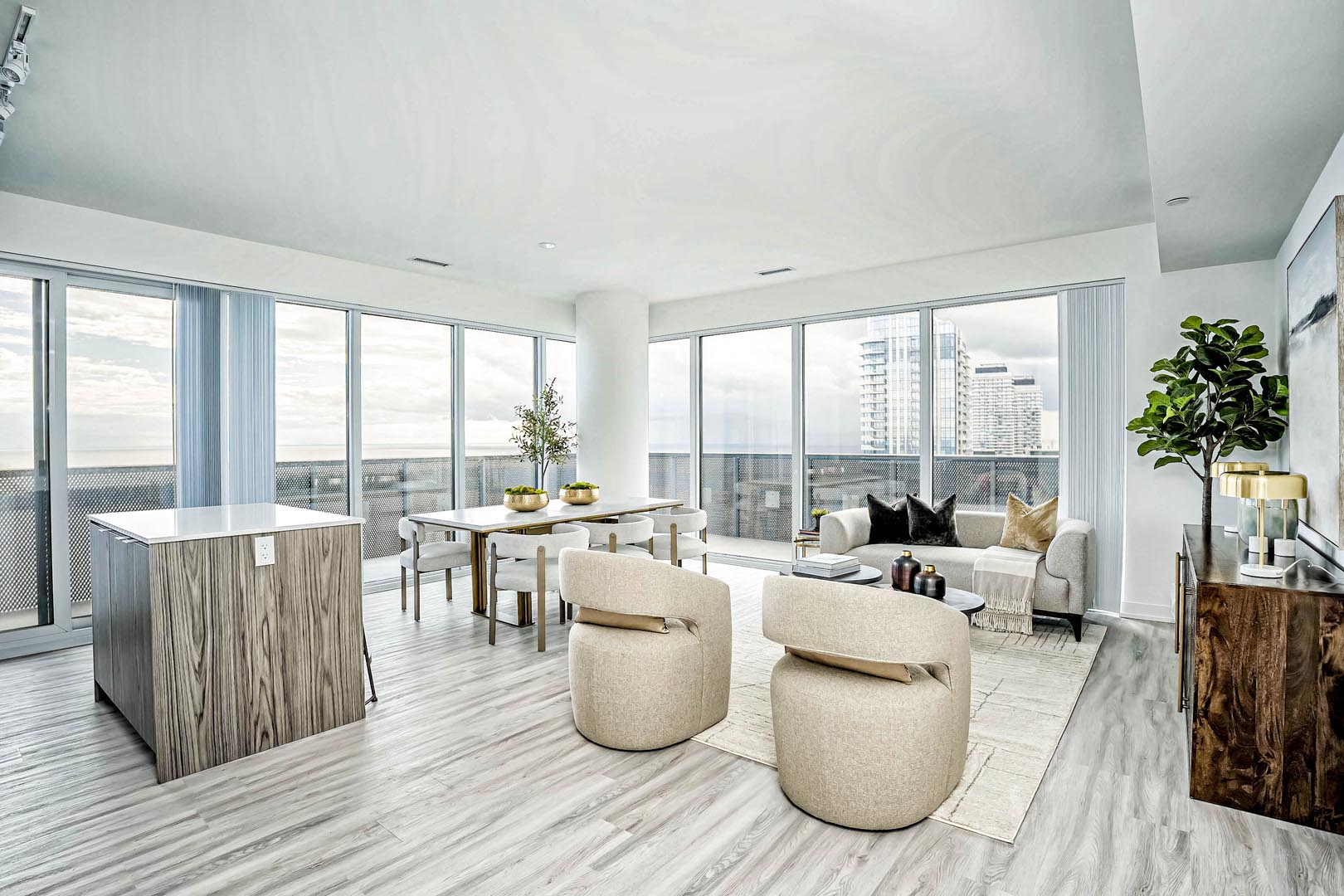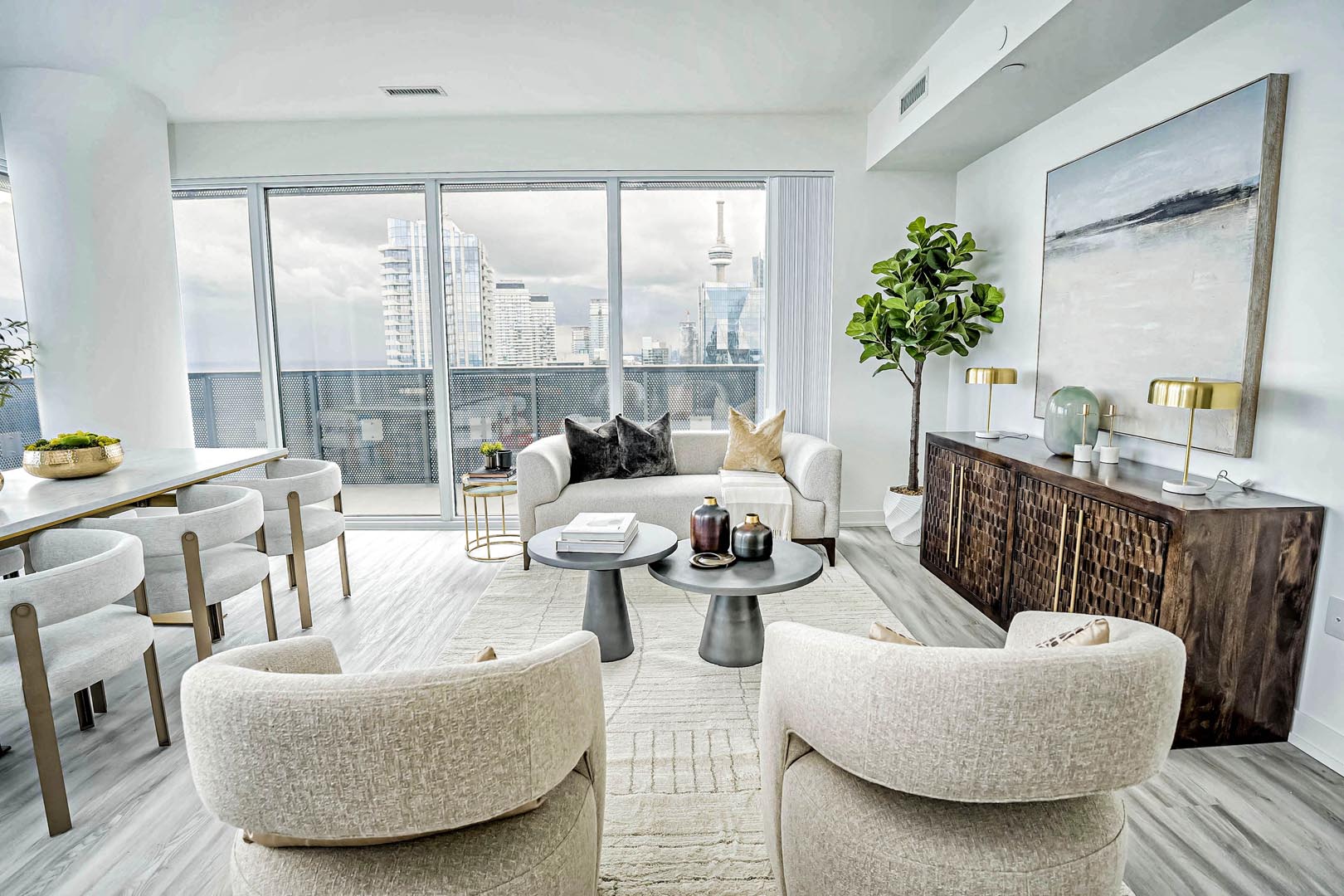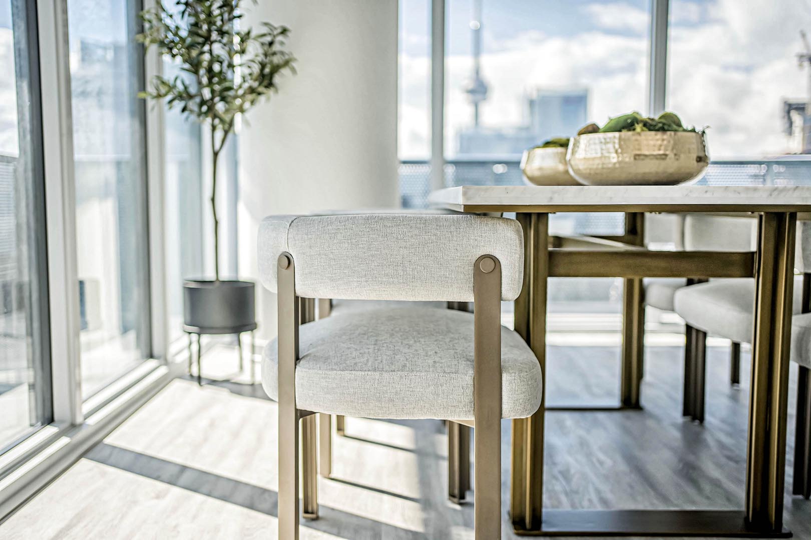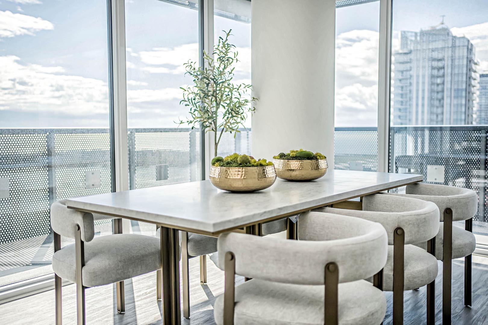 This three-bedroom model suite was designed with flexibility in mind, blending work, dining, and everyday living into one cohesive space. A sculptural marble table anchors the open area, pulling double duty as a dining surface and a polished workspace, while the solid wood credenza adds warmth and a grounding contrast to the clean lines. Throughout the suite, we leaned into layered neutrals, tactile finishes, and thoughtful furniture placement to keep the layout feeling open yet intentional. The bedrooms carry that same calm, elevated feel—refined, comfortable, and quietly luxurious. Designed for Menkes Developments.