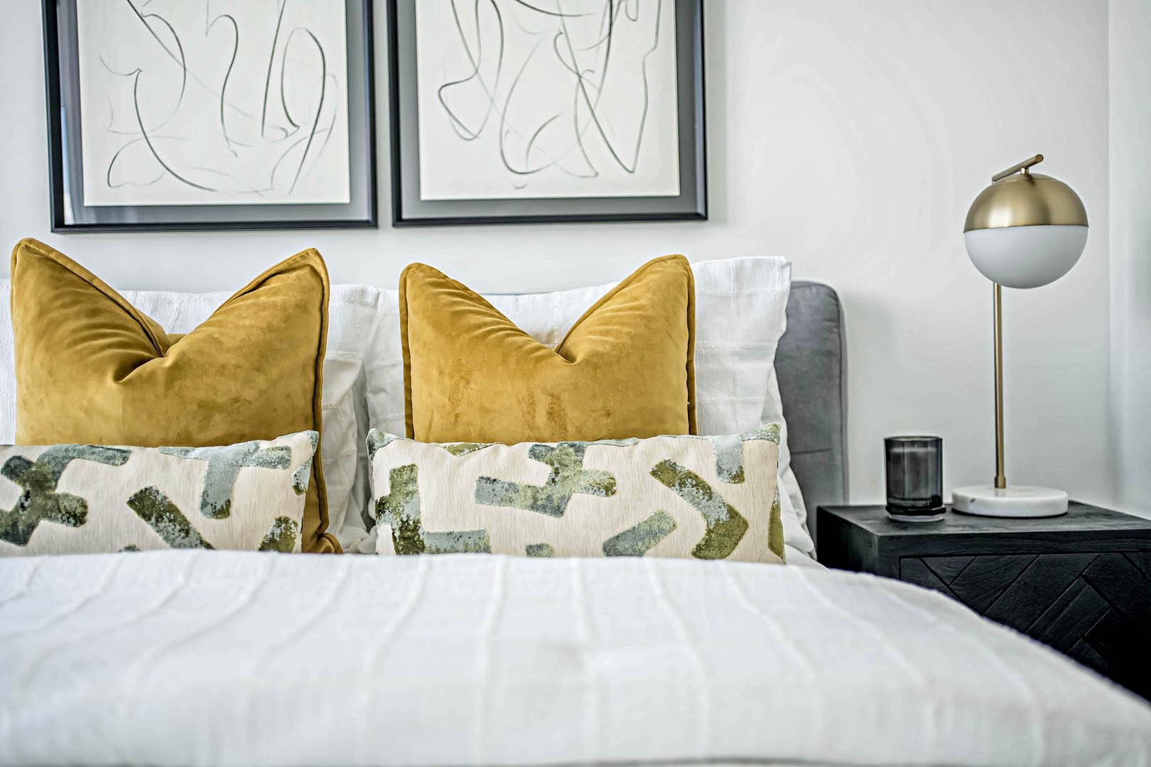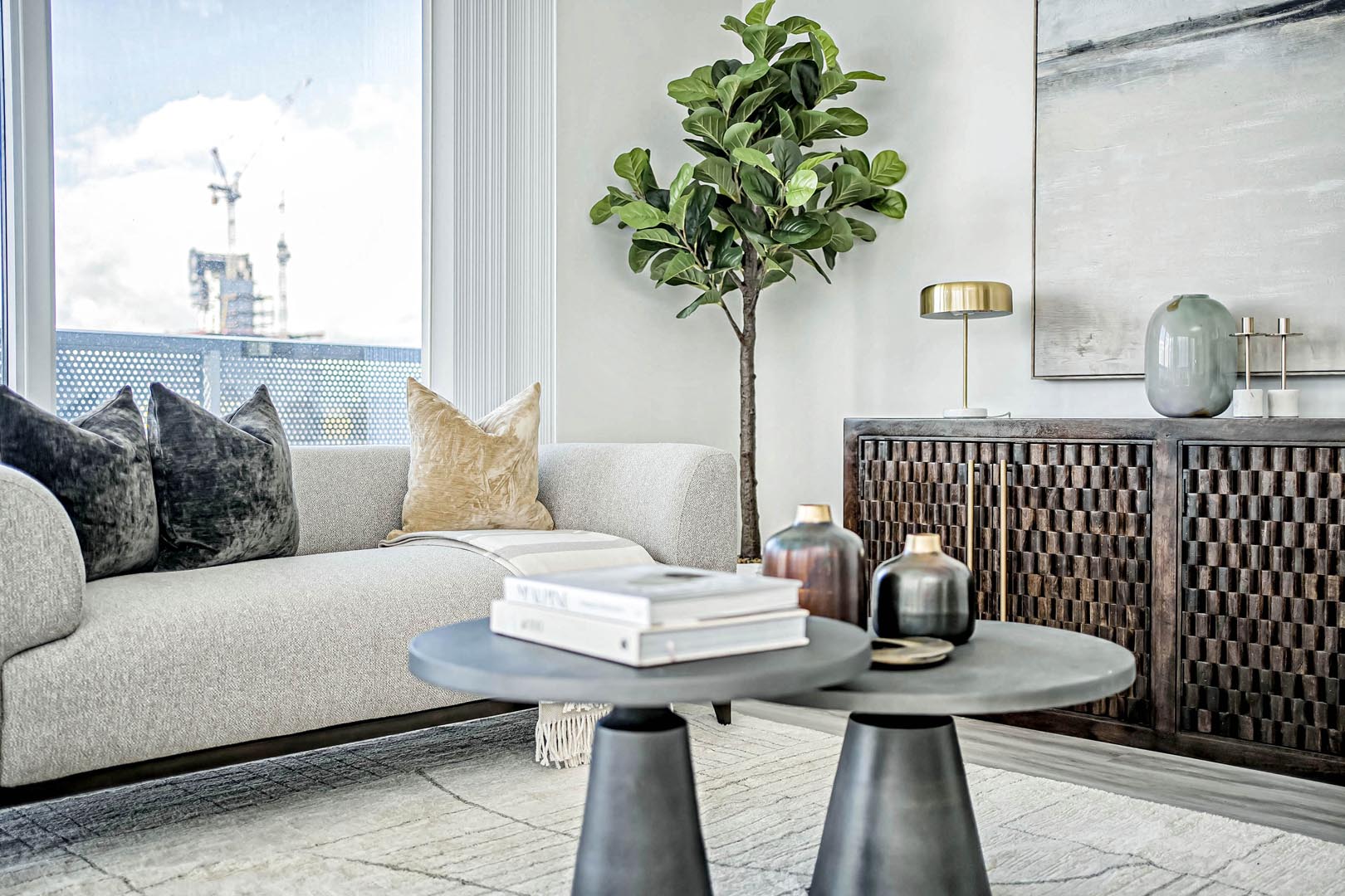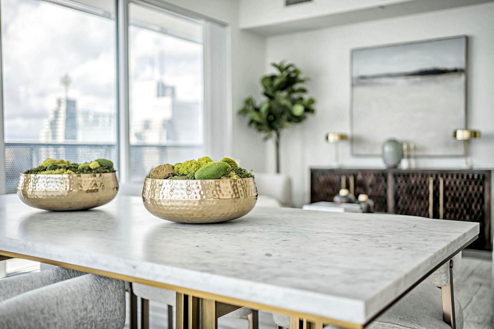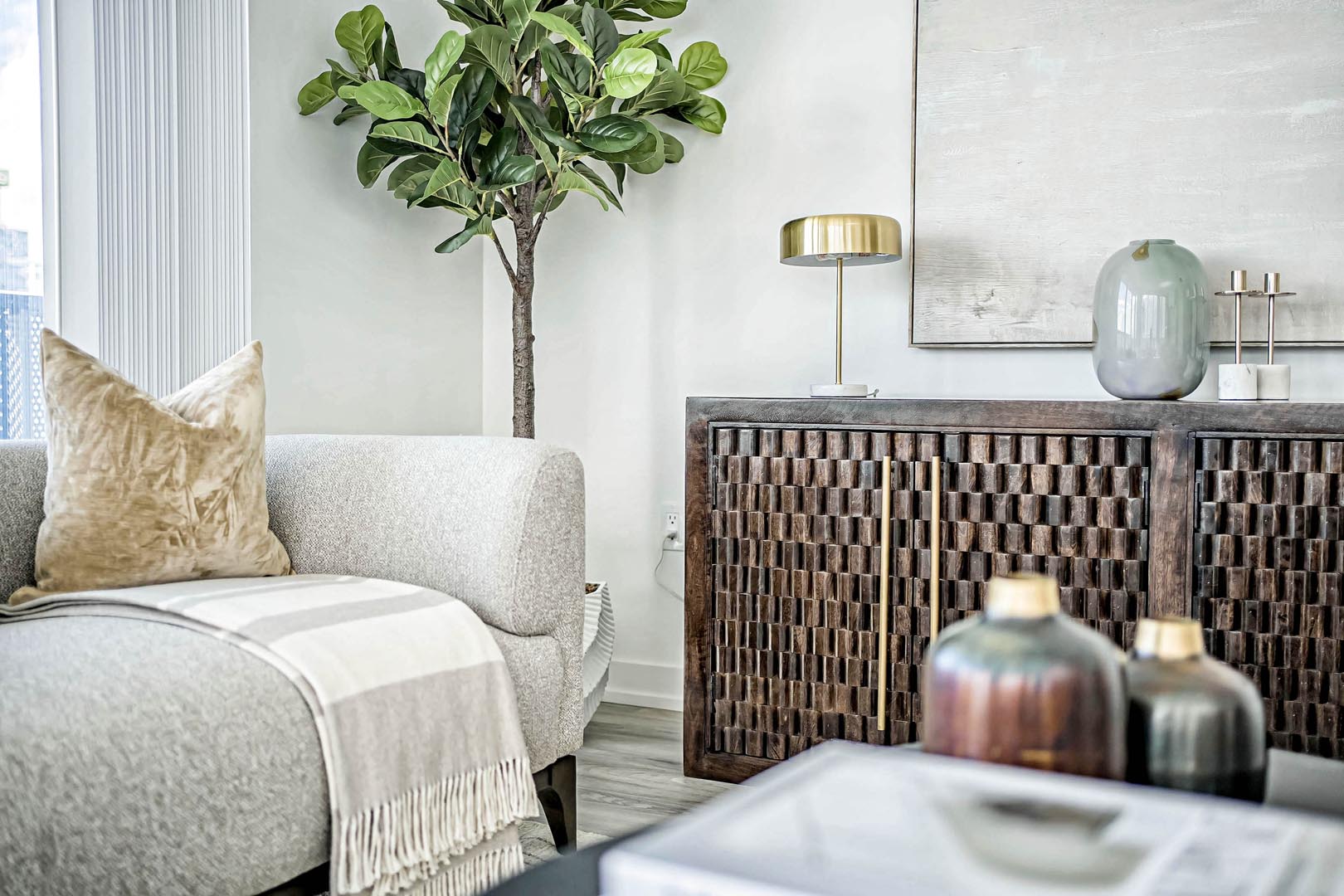 This three-bedroom model suite was designed with flexibility in mind, blending work, dining, and everyday living into one cohesive space. A sculptural marble table anchors the open area, pulling double duty as a dining surface and a polished workspace, while the solid wood credenza adds warmth and a grounding contrast to the clean lines. Throughout the suite, we leaned into layered neutrals, tactile finishes, and thoughtful furniture placement to keep the layout feeling open yet intentional. The bedrooms carry that same calm, elevated feel—refined, comfortable, and quietly luxurious. Designed for Menkes Developments.