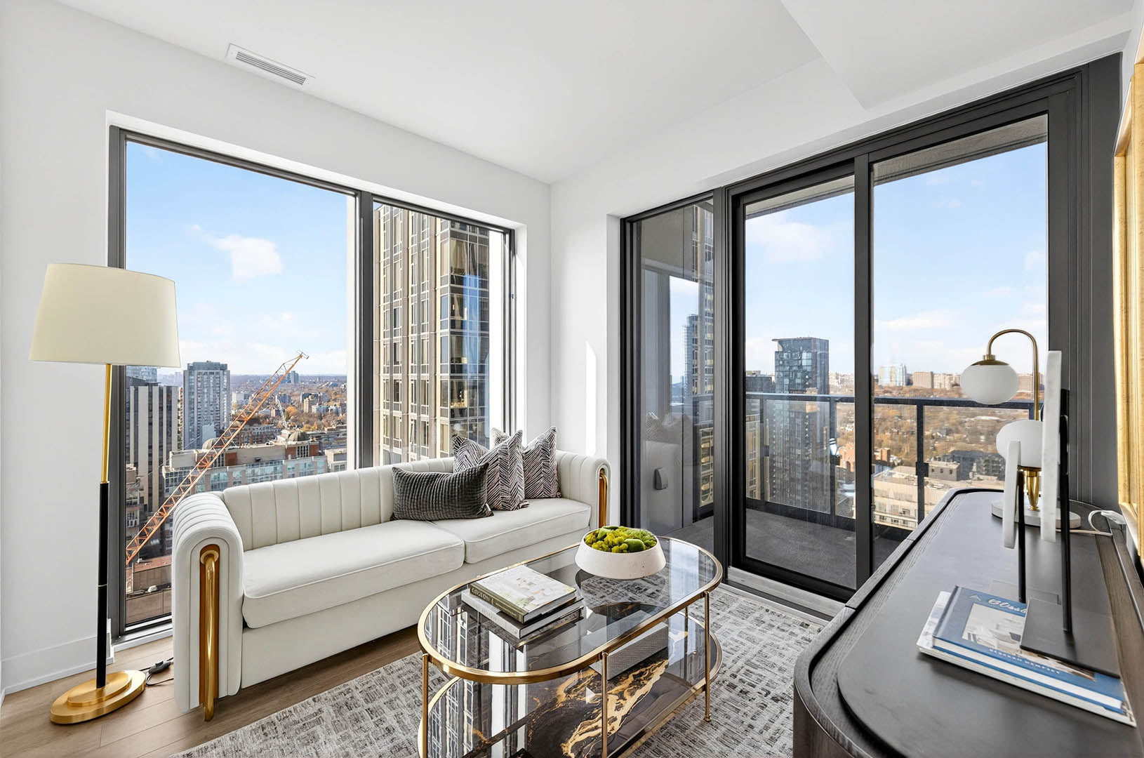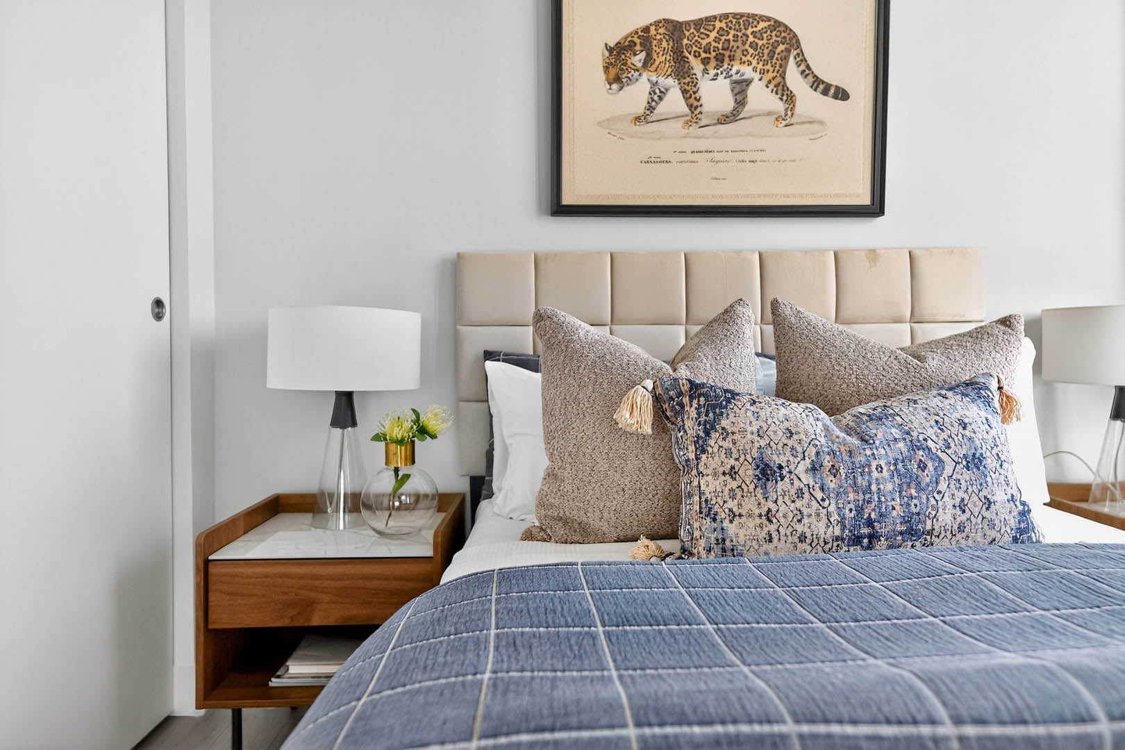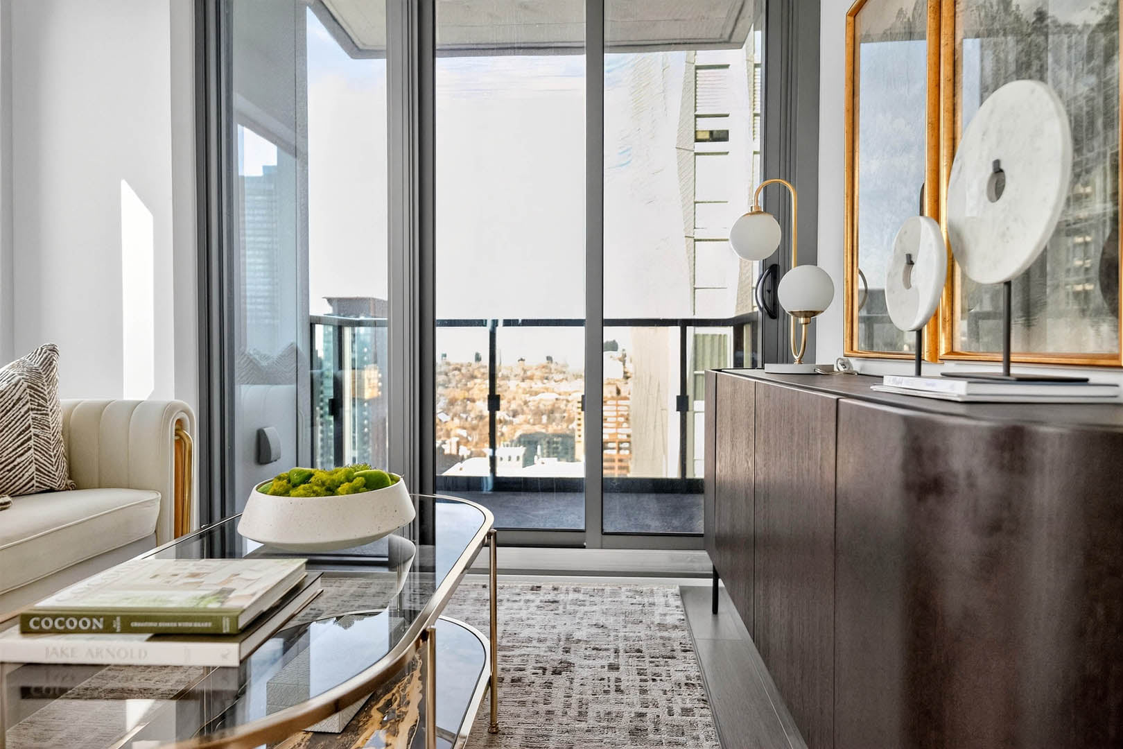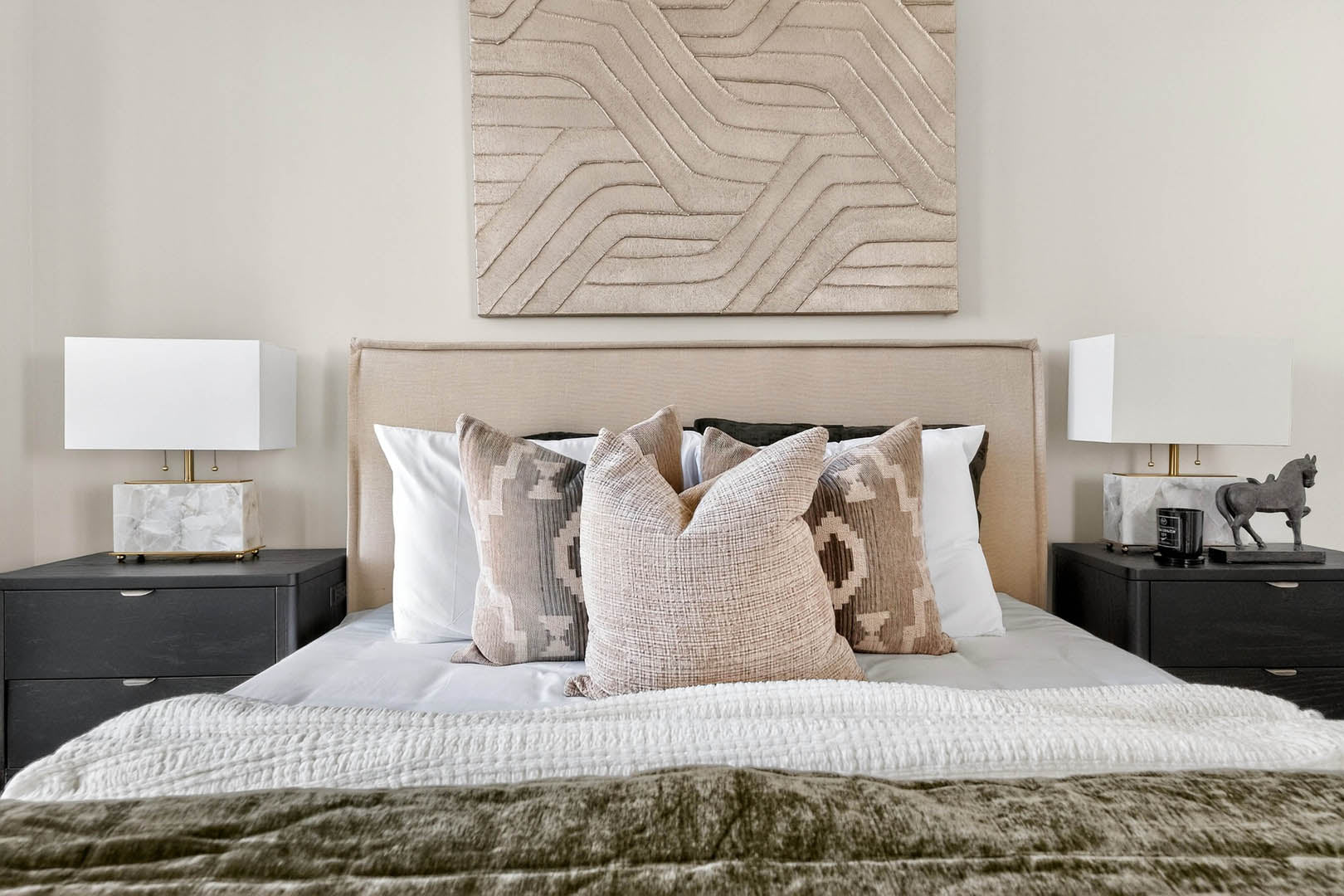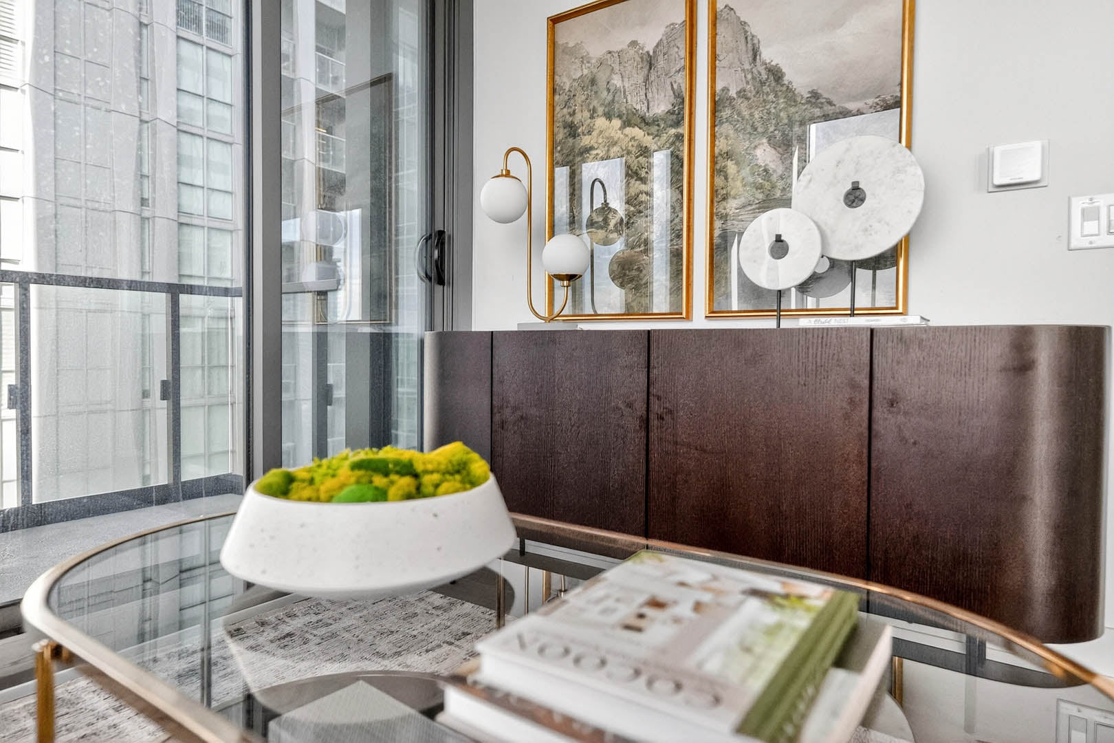 This two-bedroom model suite was all about scale, restraint, and quiet luxury—because in Yorkville, every detail needs to earn its place. We chose streamlined silhouettes and tailored upholstery to keep the main living areas feeling open, while glass, brass accents, and rich wood tones add just the right amount of polish. The furniture is intentionally compact but elevated, creating a layout that feels sophisticated without feeling tight. It’s a refined, city-forward design that looks effortless, but is anything but accidental. This model suite was presented by Great Gulf.